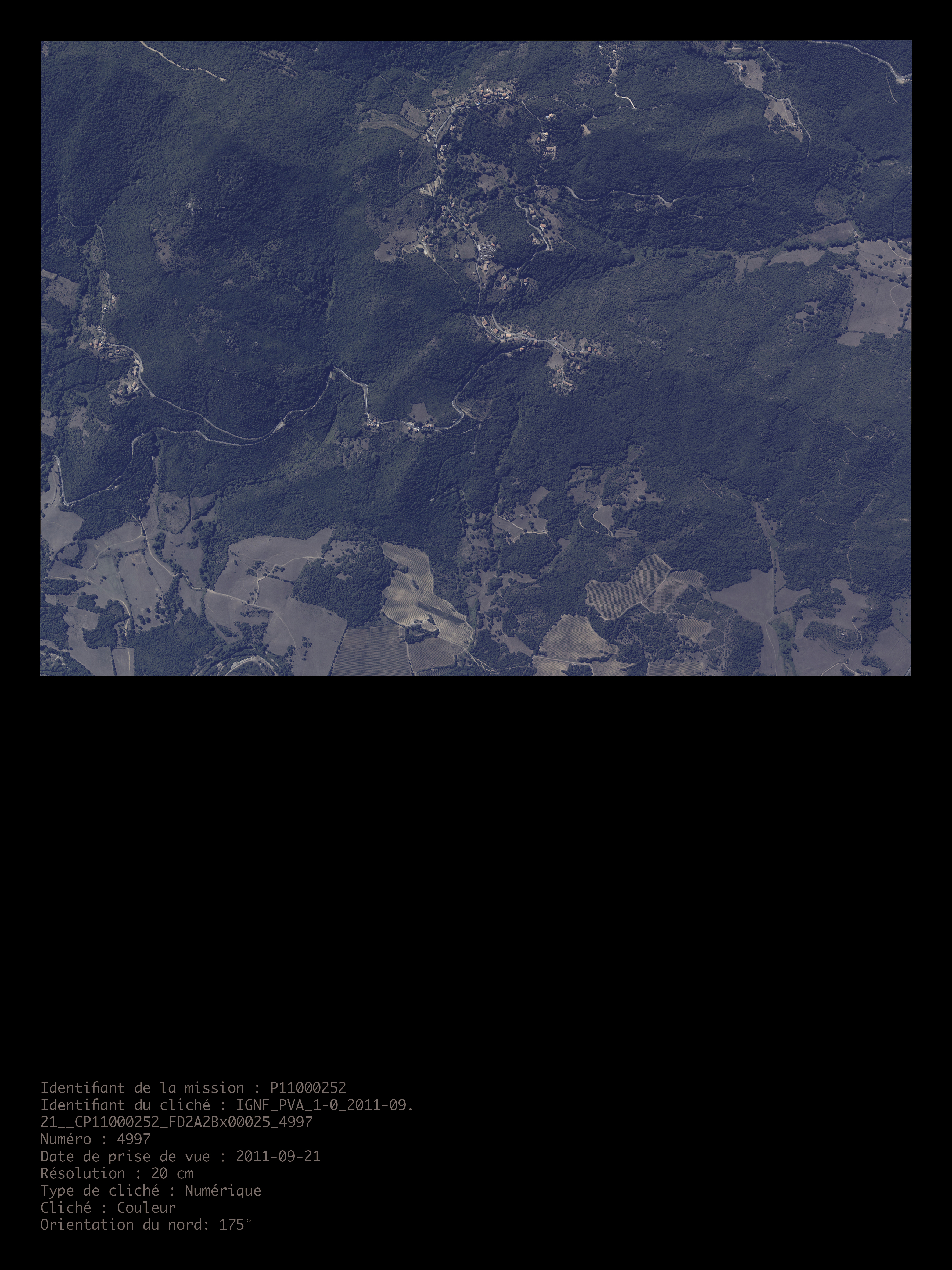 Malgré le travail de fermentation de l’image en-dehors de la visibilité des orazione, le village de Granaccia n’a pas échappé à une visibilisation photographique, celle qui se fait depuis le ciel, nous ramenant à une autre histoire de la photographie, cette fois-ci aérienne, tant dans une stratégie autant de développement que de surveillance. Permettant à la fois l’accumulation documentaire (les Observatoires Photographique du Paysage) et la cartographie urbanistique du territoire, un nouvel enjeu de l’exposition programmée se met en place : celui du contrôle Et finalement, une archive du village, non-consentie, menée par le gouvernement français, existait déjà, par la surveillance, et cette archive perdure, utilisée par le Ministère de l’Intérieur et le Ministère de la Transition Écologique et de la Cohésion des Territoires (avec également l’IGN, la DGFIP, Etalab, et l’ANCT). Je remets en avant l’intérêt politique de ces images avec le nom des missions, la date, le procédé photographique, etc, les remettant en exposition, en confrontation à mes propres images, face à une spéculation immobilière inédite qui transforme les structures des villages.